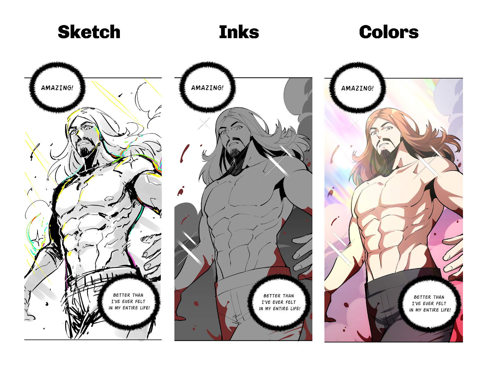 Yes, that really is a six-pack on Asmongold in Episode 1…consider it the magic of comic panels at work. To show how his look came together, we’ve included a panel in three stages: sketch, inks, and full color. The sketch lays the groundwork, the inks sharpen his form, and the final color pass somehow delivers a six-pack worthy of a fantasy MMO trailer. How he maintains it remains a mystery…maybe this is what Asmon really looks like after one too many react streams.